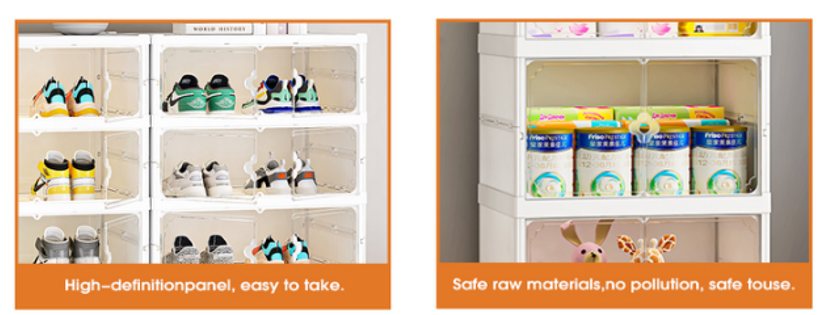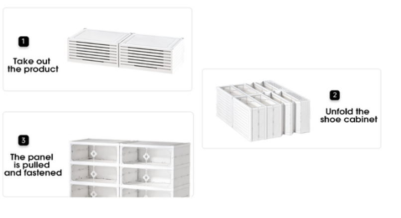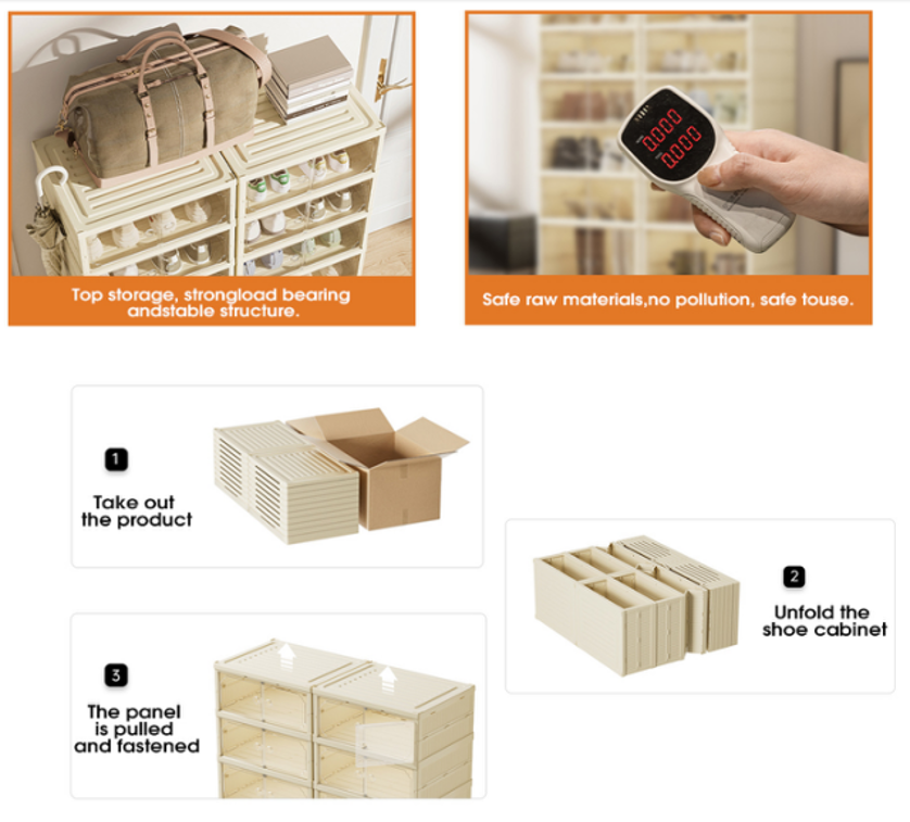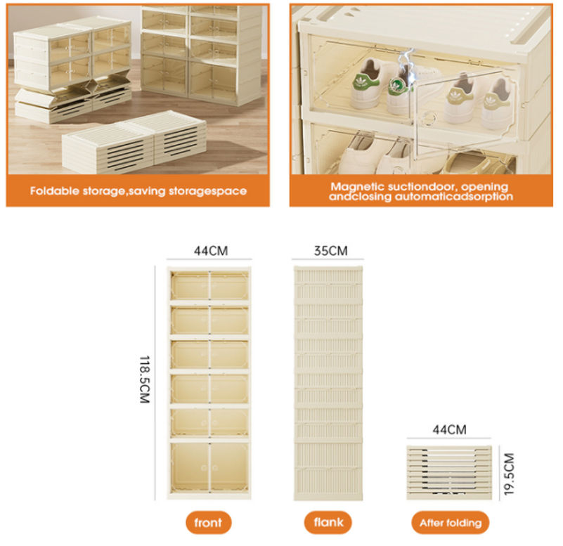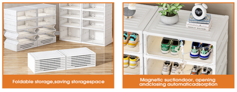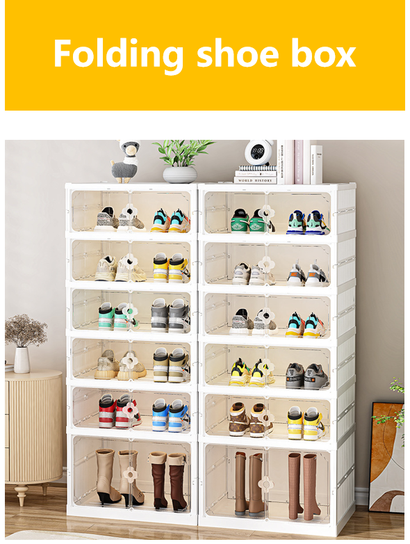 Folding Shoe Box .The foldable design lets you store the unit flat when not in use. Thickened, durable material supports heavy footwear without bending. Perfect for entryway floors, closet bottoms, or mudrooms. The open front (or optional door, depending on model) allows quick grab‑and‑go access. No hardware or tools needed – sets up in under a minute.